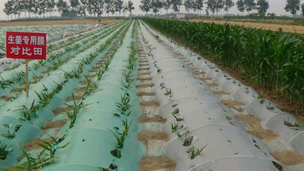 专用膜覆盖栽培,既通过覆盖提高了环境温度,又因膜的专用特性,创造了适于生姜生长的光照环境,勿需再添加遮阳网遮光,实现了一膜两用;而采用普通膜覆盖栽培,则必须加盖遮阳网遮光。因此,专用膜覆盖既节约了遮阳网投资,又省去了加盖及撤除遮阳网的用工。